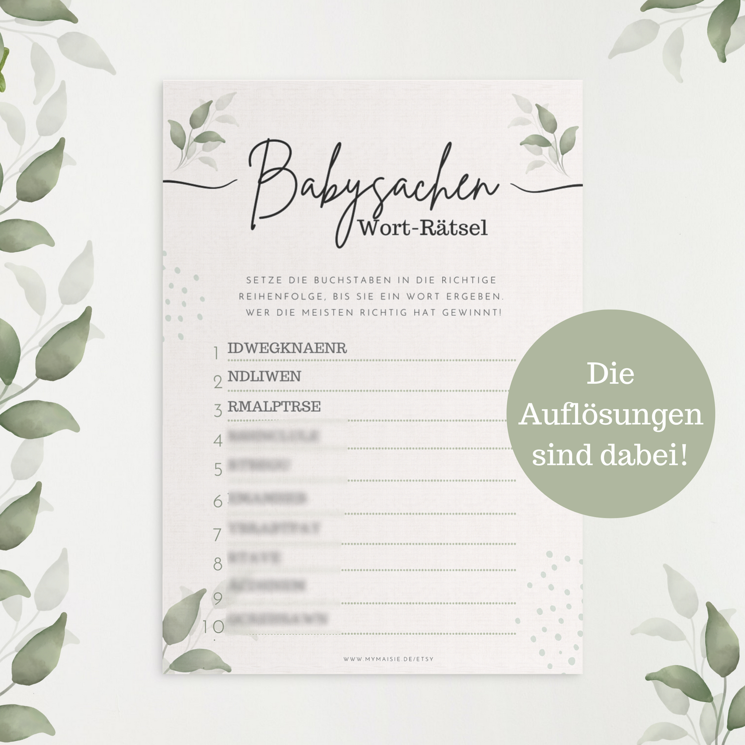 Die Buchstaben eines Begriffes rundum “Babysachen” sind in der falschen Reihenfolge, kannst Du entziffern, welcher Begriff gesucht wird?